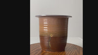 This is a vintage studio pottery cachepot. Signed by the artist, the hand-crafted vase has a sweeping brown and tan exterior glaze with a soft periwinkle interior.
